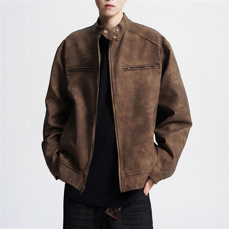 A handsome man in a stylish leather motorcycle jacket. The jacket features silver zippers and a snap collar, offering an edgy and modern look perfect for men's street style and fall fashion.